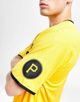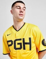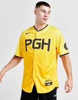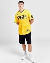 Metti in chiaro chi stai sostenendo con questa maglia MLB Pittsburgh Pirates City Connect da uomo di Nike. Disponibile in una colorazione oro, questa maglietta è realizzata con un tessuto in poliestere liscio e traspirante per mantenerti comodo durante il giorno. Presenta una chiusura con bottoni e maniche corte per un taglio classico e una copertura personalizzata. Rifinito con il marchio Pittsburgh e Nike sul davanti. Lavabile in lavatrice. | Il nostro modello è alto 6’0″ con un petto di 38,5″ e indossa una taglia M.